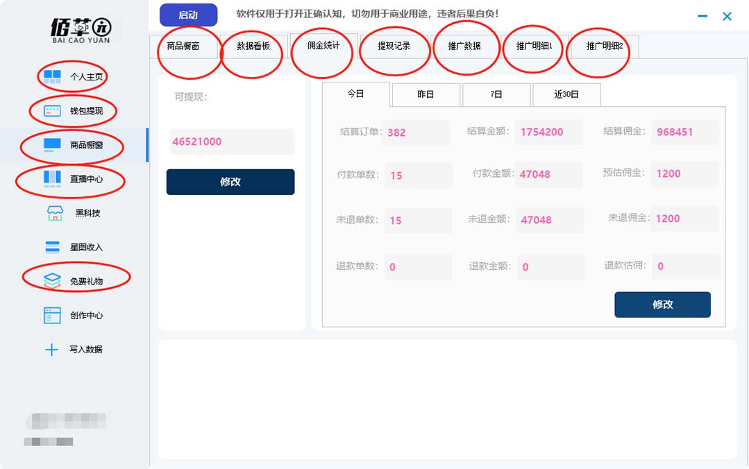 3、橱窗数据:数据看板 佣金统计 提现记录 推广明细 今日数据等。